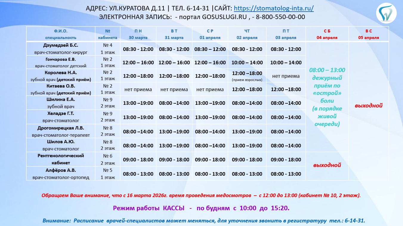Расписание работы врачей-стоматологов и рентгенологического кабинета с 30.03.2026 года по 04.04.2026 года. Внимание расписание может меняться, для уточнения звонить по телефону в регистратуру 6-14-31