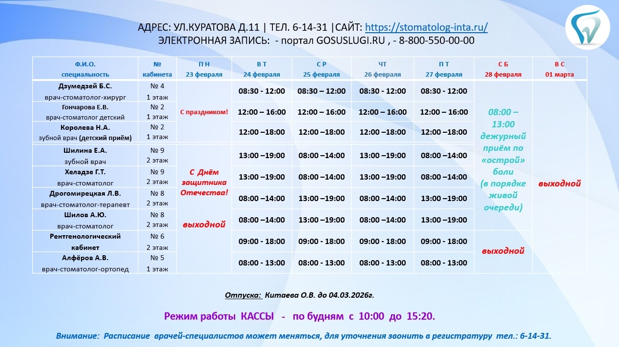 Расписание работы врачей-стоматологов и рентгенологического кабинета с 24.02.2026 года по 28.02.2026 года. Внимание расписание может меняться, для уточнения звонить по телефону в регистратуру 6-14-31