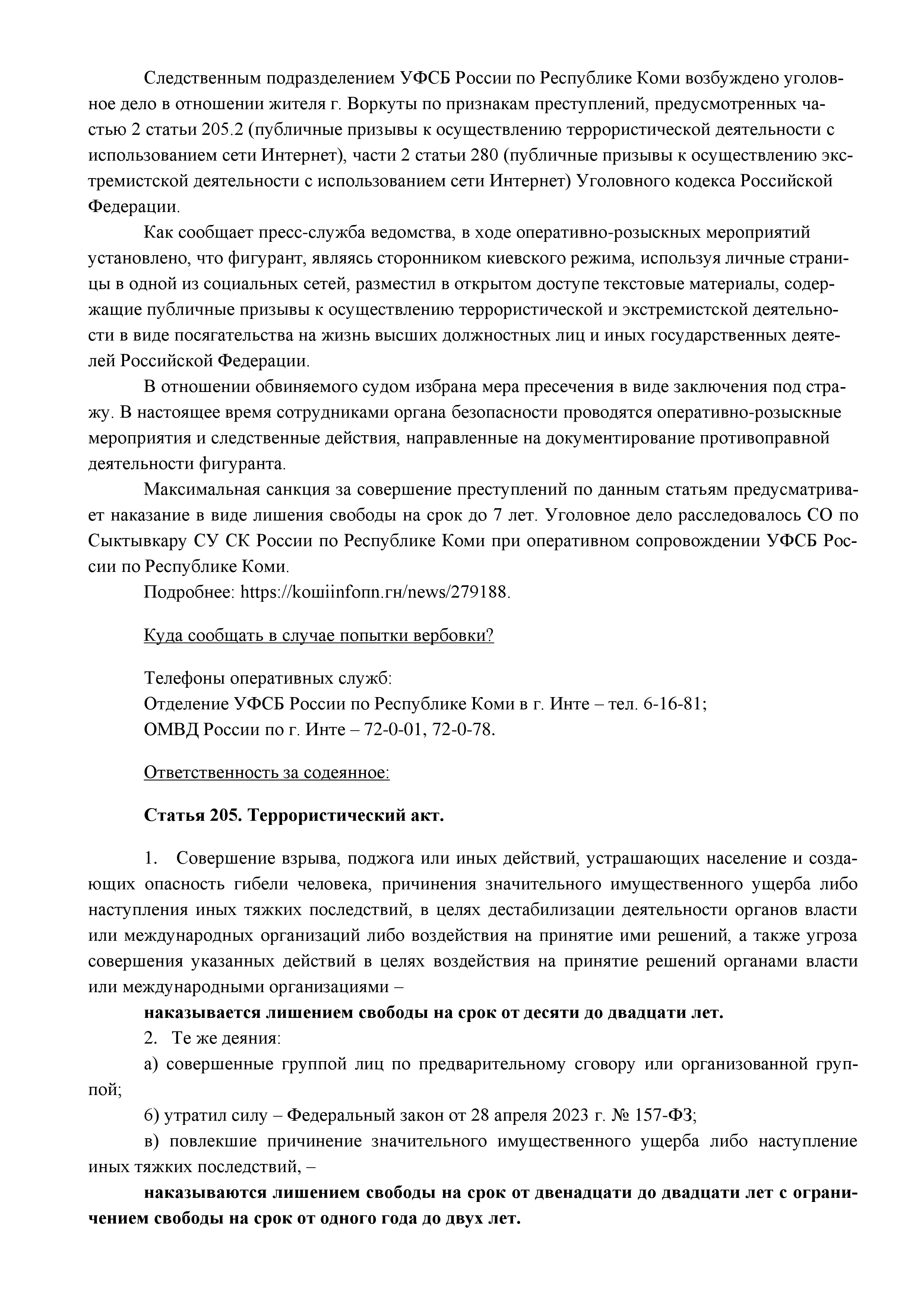 Номера телефонов оперативных служб на территории МОГО "Инта", по которым сообщать о случаях попытки вербовки: