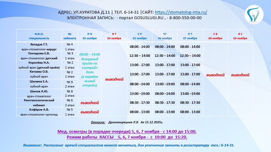 Расписание работы врачей-стоматологов и рентгенологического кабинета с 03.11.2025 года по 08.11.2025 года. Внимание расписание может меняться, для уточнения звонить по телефону в регистратуру 6-14-31