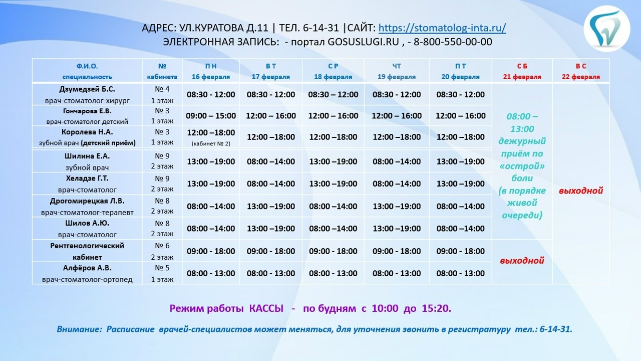 Расписание работы врачей-стоматологов и рентгенологического кабинета с 16.02.2026 года по 21.02.2026 года. Внимание расписание может меняться, для уточнения звонить по телефону в регистратуру 6-14-31