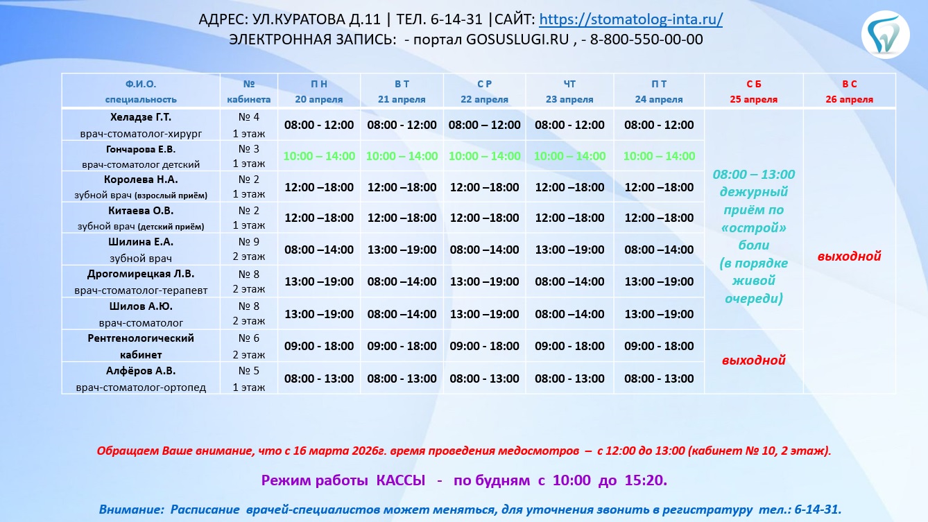 Расписание работы врачей-стоматологов и рентгенологического кабинета с 20.04.2026 года по 25.04.2026 года. Внимание расписание может меняться, для уточнения звонить по телефону в регистратуру 6-14-31