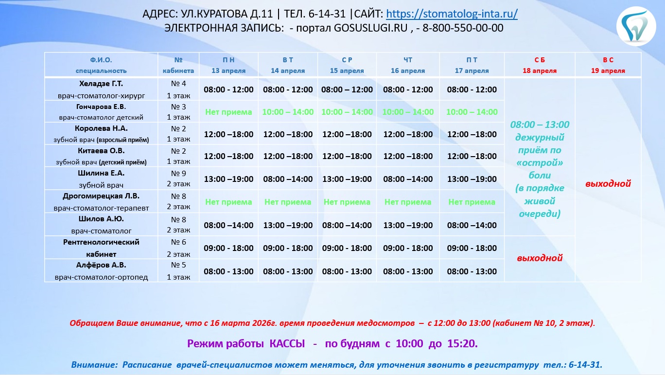 Расписание работы врачей-стоматологов и рентгенологического кабинета с 14.04.2026 года по 18.04.2026 года. Внимание расписание может меняться, для уточнения звонить по телефону в регистратуру 6-14-31